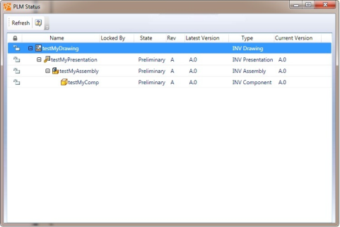 You can minimize the PLM Status dialog box and continue working with Inventor, make changes in the structure, or lock/unlock designs in the design structure.