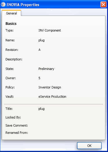 For the design, the ENOVIA Properties dialog box lists the type, name,
