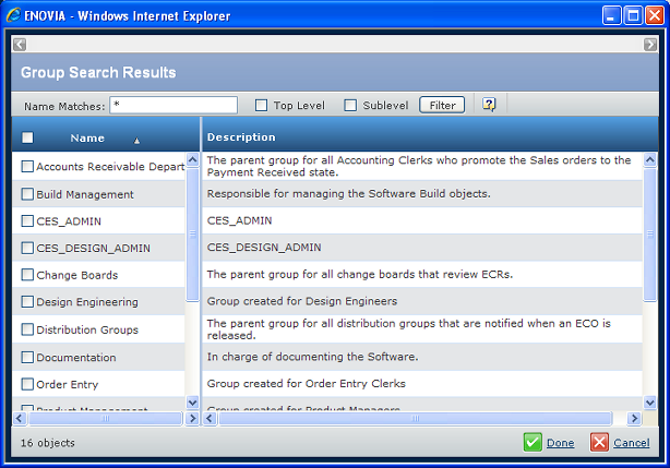 This example shows the Group Search Results; the Role Search Results works the same way.
